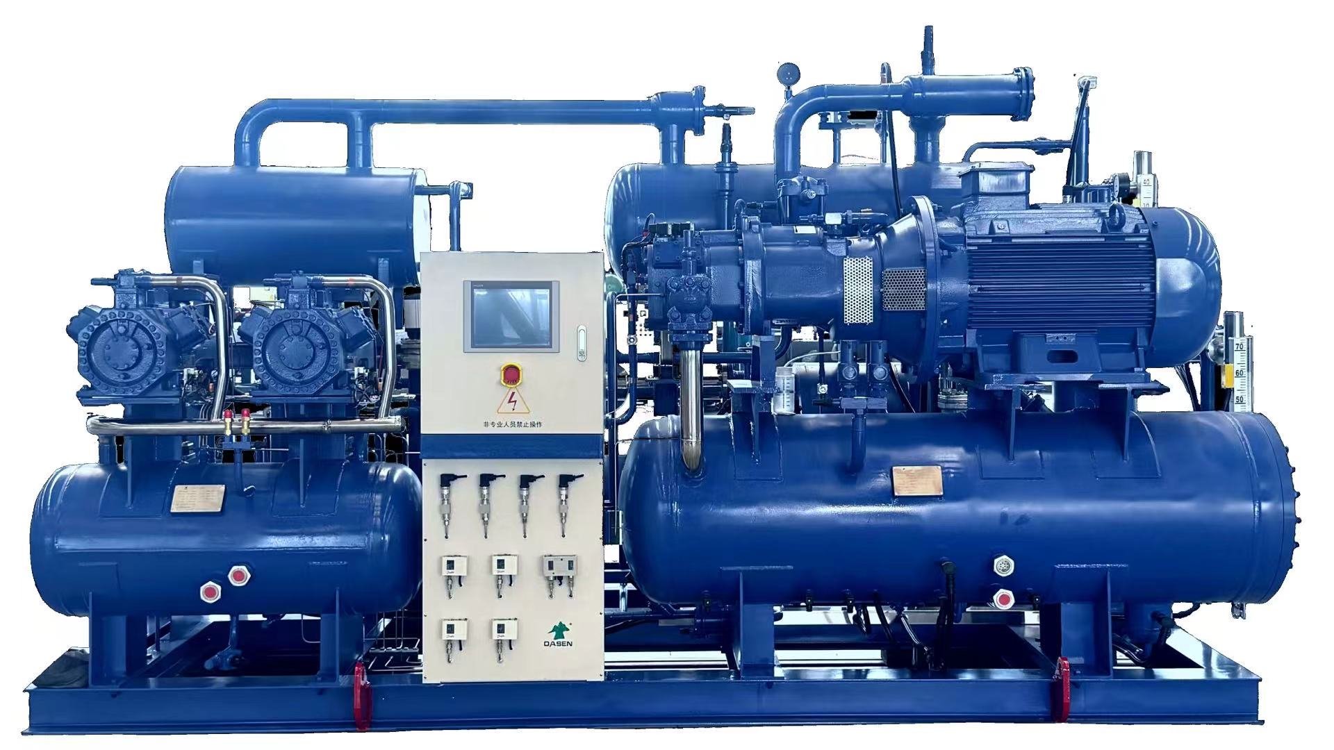 復(fù)疊撬塊適用于蒸發(fā)溫度在-50~-25℃之間的多種工況,在速凍工況下蒸發(fā)溫度更低,速凍效果更好,運(yùn)行能耗略低于NH3的雙機(jī)雙級(jí)系統(tǒng),特別適合大中型速凍系統(tǒng)
